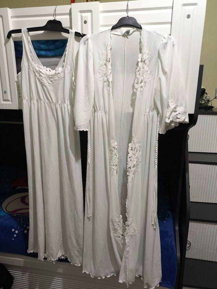 Bu beyaz uzun kadın sabahlık, bol kesim ve askılı kollarıyla bohem tarzını yansıtır. Nakış detayları ve hafif dokusuyla rahat kullanım sunar.