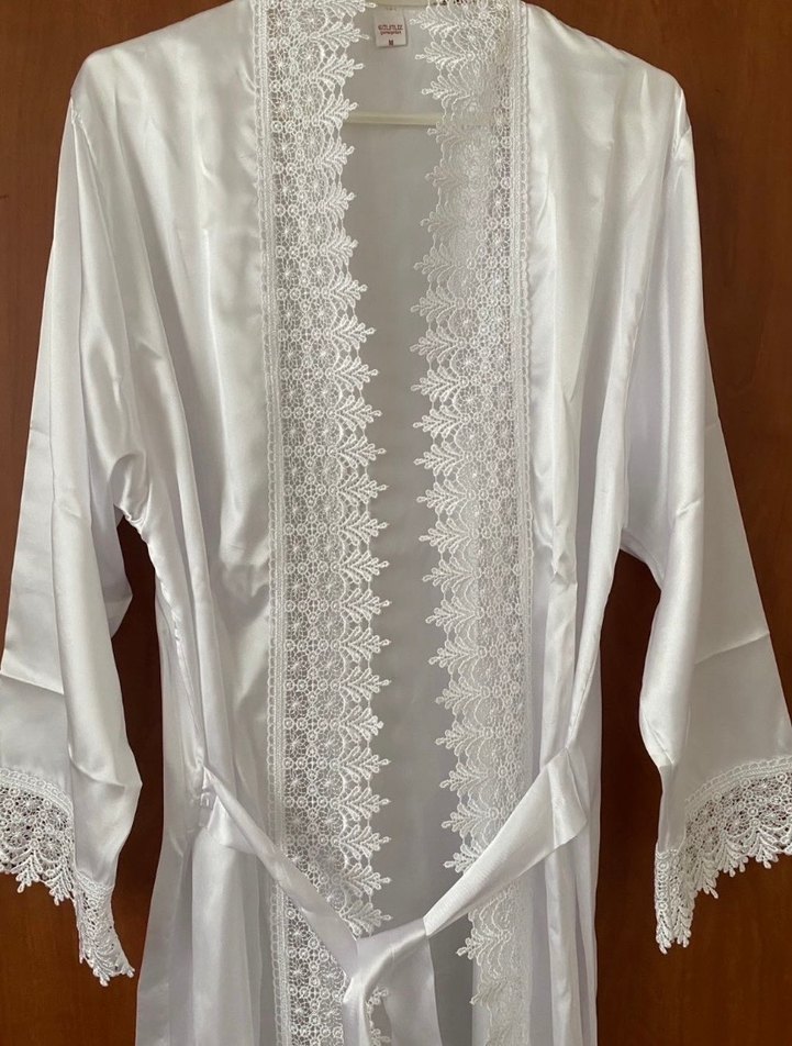 Bu beyaz sabahlık, ön ve kollarda nakış detaylarına sahip, parlak kumaştan ve bol kesim uzun boydadır. Askılı kollu ve kuşaklıdır.