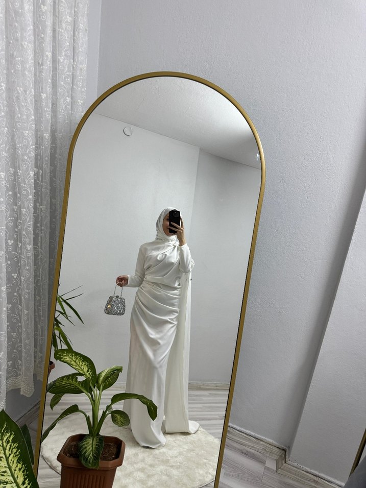 Beyaz, uzun saten elbise yüksek yakalı, uzun kollu ve drapeli tasarıma sahip. Nakış detaylarıyla zarif ve modern bir duruş sunar.