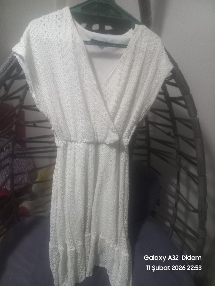 Beyaz, V yaka ve kolsuz, nakışlı desenlere sahip midi elbise. Salaş kesim ve drapeli stilde, trend günlük kullanım için uygundur.