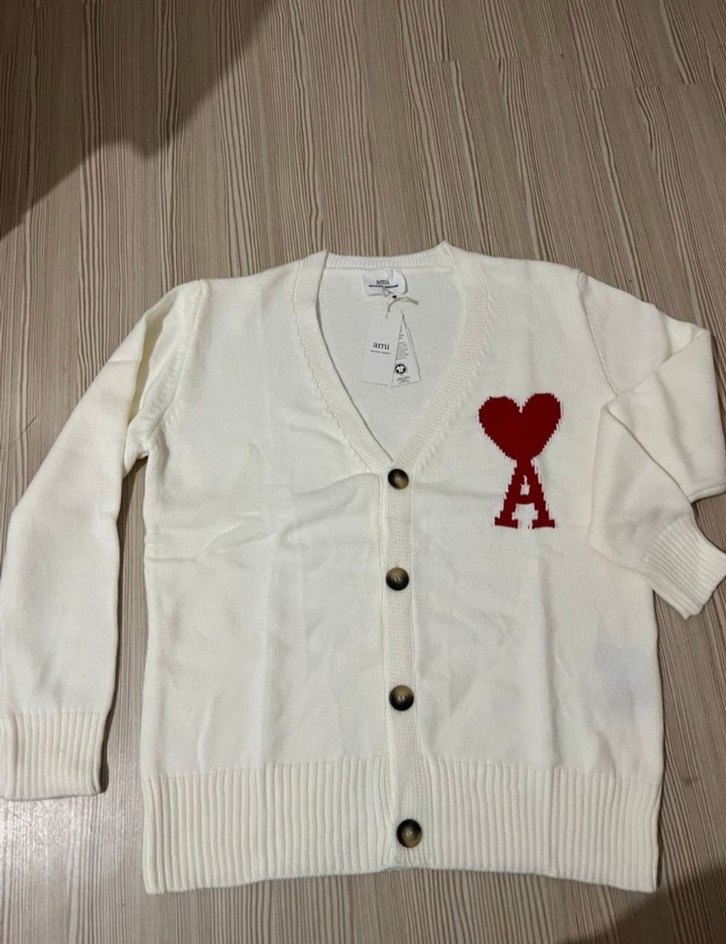 Uzun kollu, V yaka beyaz örgü kadın hırka, kırmızı nakışlı kalp ve harf detayıyla. Rahat kesimli, midi boyda, günlük sokak stiline uygun.