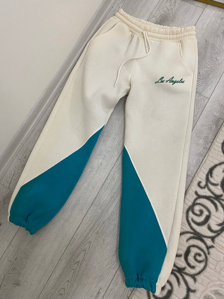 Beyaz ve pastel mavi detaylı, nakışlı "Los Angeles" yazılı, bağcıklı bel bandına sahip bol kesim kadın eşofman altı. Günlük rahat kullanım için uygundur.