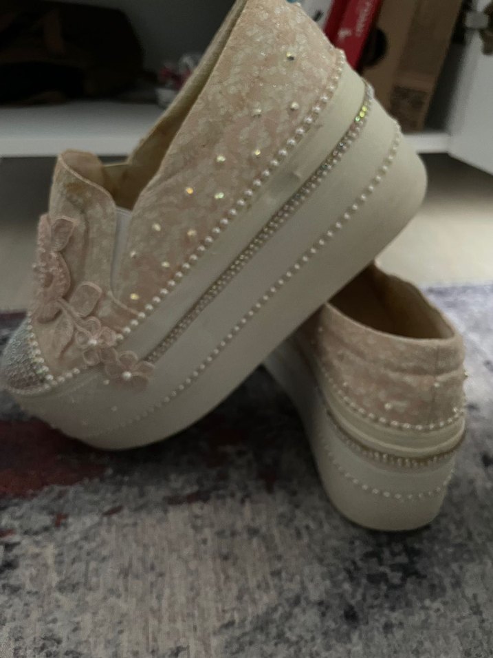 Nakışlı desenler ve boncuk detaylarıyla beyaz Kauçuk tabanlı, geleneksel ve trend rahat stil sunar. Özel günler için uygundur. #yüksektopuklu #kınaayakkabısı #abiyeayakkabısı #dügünayakkabısı #1kerekullanıldı