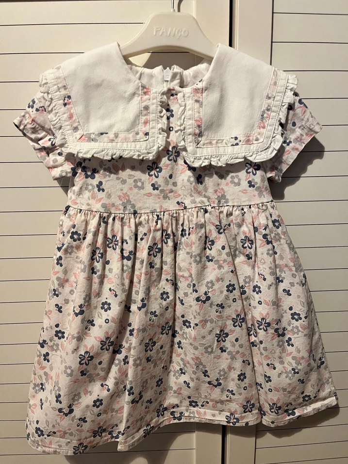 Kısa kollu, yakalı ve fırfırlı detaylara sahip, nakışlı pastel çiçek desenli, rahat kesim kız elbisesi.