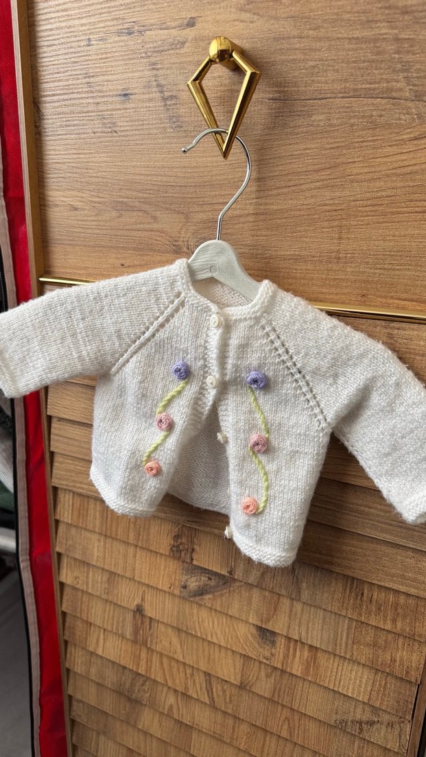 Uzun kollu, bol kesim beyaz örme kız hırka, pastel nakışlı çiçek detayları ile vintage tarzda.
