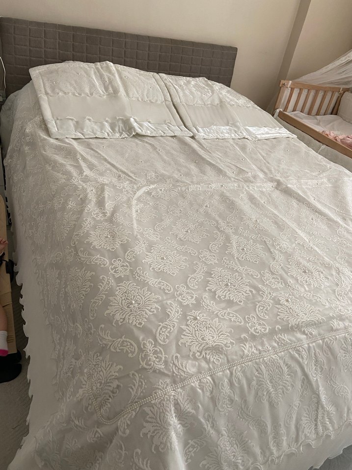 Yumuşak beyaz tonlarda detaylı nakışlarla süslenmiş beyaz yatak örtüsü. Uyumu sağlayan yastık kılıfları ile birlikte.