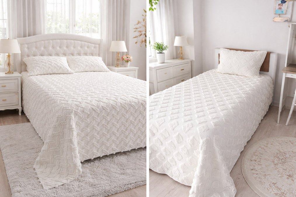 Nakışlı desenli beyaz yatak örtüsü, odaya doku ve zarafet katıyor. Açık renk, odanın aydınlık ve uyumlu görünmesini sağlar. ️ ister çift kişilik ister tek kişilik için mj atınız