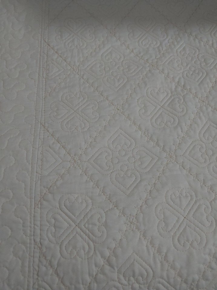 Beyaz yatak örtüsü, yumuşak kumaş üzerinde zarif nakış desenleriyle hafif dokulu bir görünüm sunar. ️