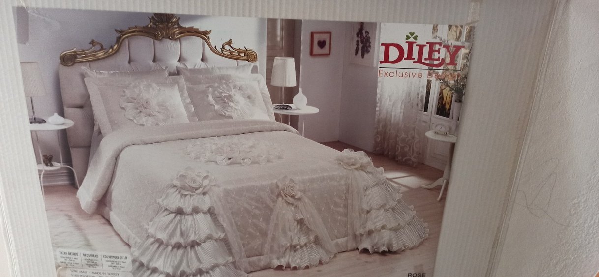 Yumuşak fırfırlı kenarları ve çiçek detaylarıyla beyaz, nakışlı yatak örtüsü. "D Excl" marka logosu görülmektedir. ️