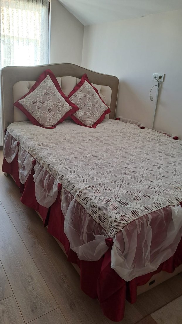 Nakışlı beyaz yatak örtüsü ve kırmızı detaylı kırlentlerden oluşan set. Yatak etrafında beyaz tül ve kırmızı zeminle yumuşak bir görünüm sunar. ️