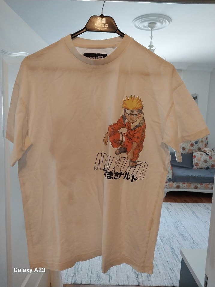 Pamuk kumaştan, kısa kollu, bol kesim beyaz tişört. Arka kısmında Naruto karakterleri baskılı, bisiklet yaka, gündelik sokak stili. 36 Beden. S beden.