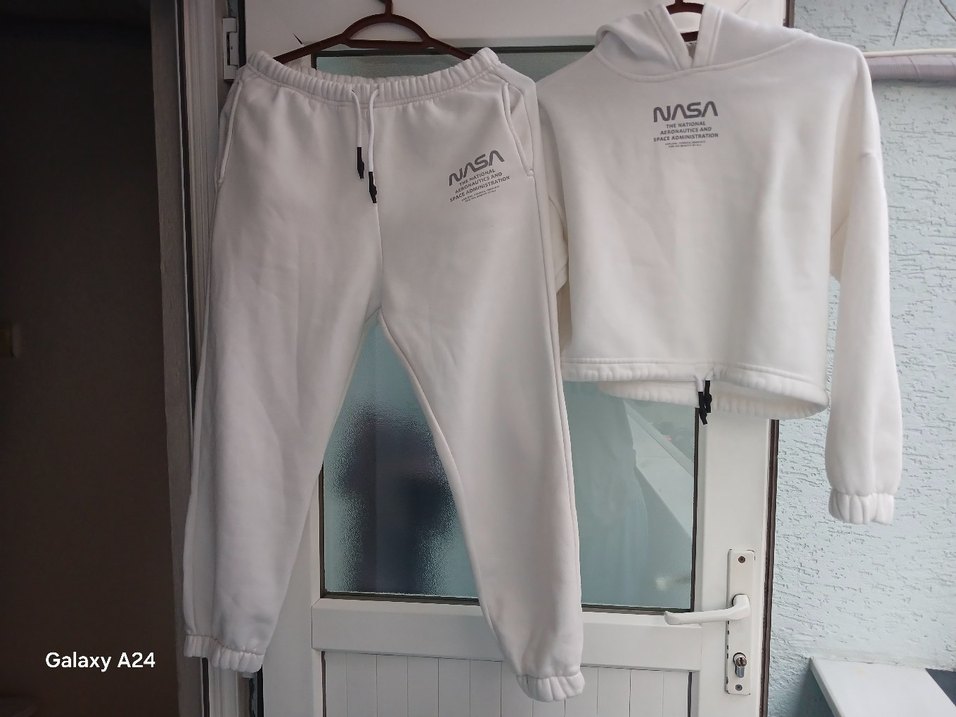 Ürünün arka kısmında hafif sarılık mevcuttur. Yumuşak ve sıcak kumaştan, NASA baskılı, bol kesim beyaz eşofman altı. Rahat ve şık, dış mekan kullanımı için uygun. ️