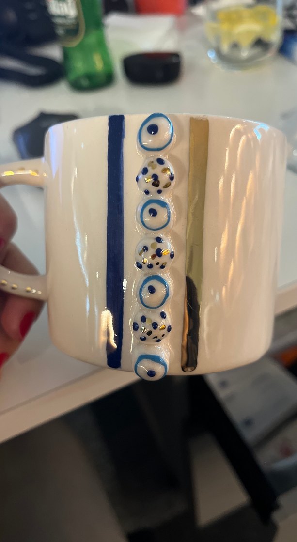 Beyaz Nazar Boncuğu Desenli El yapımı Seramik Kupa