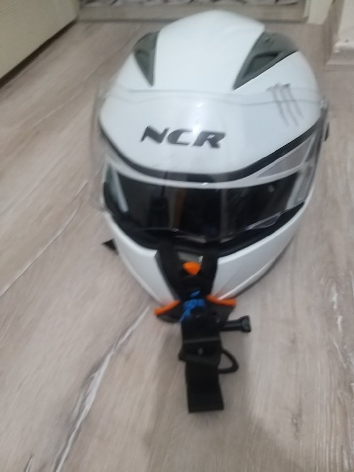 Dayanıklı plastikten yapılmış, baskılı NCR logosu bulunan beyaz motosiklet kaskı. Cırt cırtlı kayış ve minimalist, rock punk tarzı tasarıma sahiptir. ️
