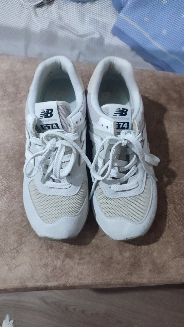 Beyaz New Balance 574 kadın spor ayakkabısı, düz kauçuk taban ve desensiz tasarıma sahiptir. Trendy rahat sokak stili için zahmetsiz şıklık sunar. az kullanıldı orjinaldir