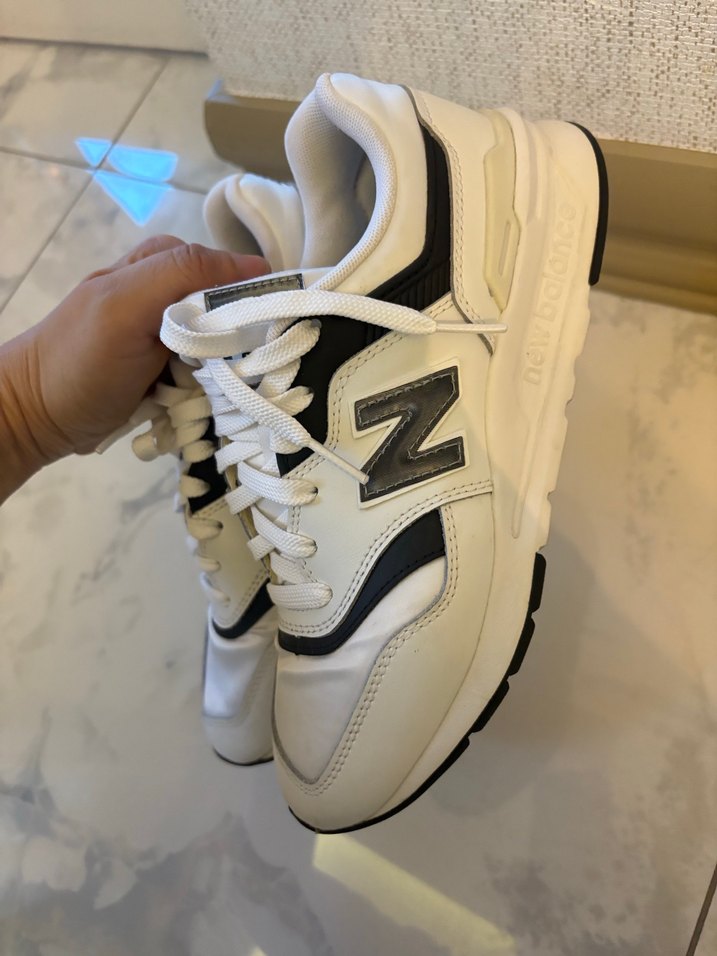 Beyaz New Balance spor ayakkabılar, bağcıklı tasarımı ve hafif renk tonlarıyla günlük ve spor kullanıma uygundur.