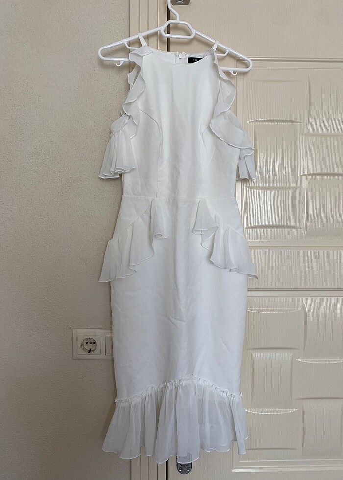 Sadece 1 kez nikahta kullanıldı xs beden ama S beden olanda giyebilir çok güzel ve zarif bi elbise 167 boyum 52 kiloyum hafif diz üstü oluyor içi astarlı iç göstermez