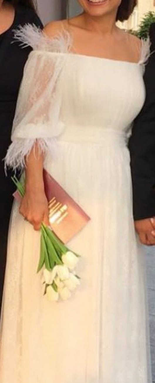 Nikahta giyildi beyaz omuzları açık elbise moda evinde dikildi