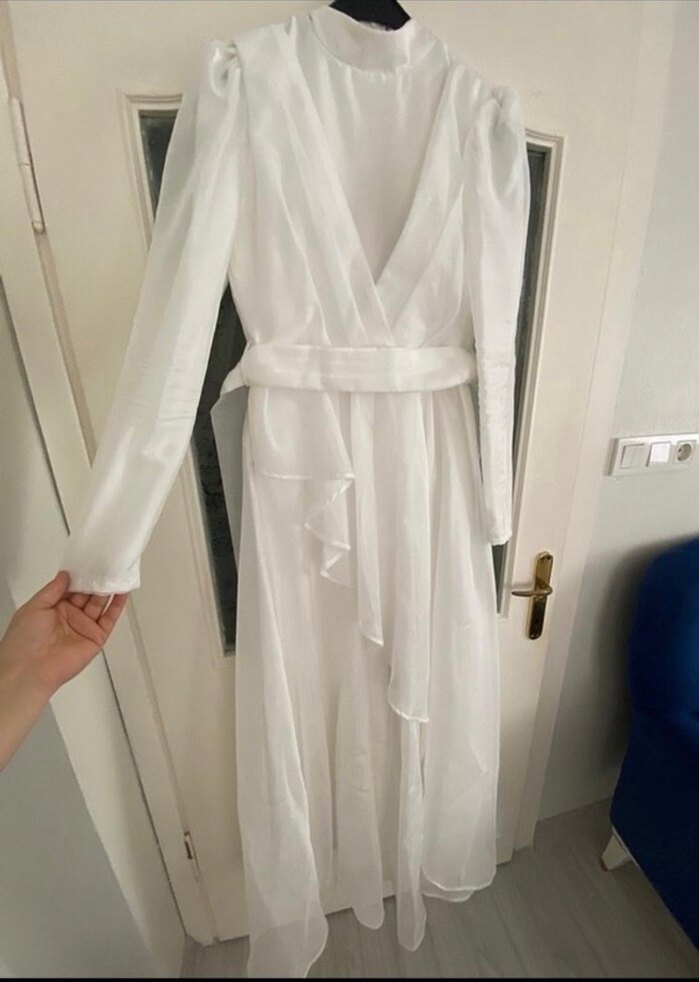 Bu beyaz uzun elbise, yüksek yakalı ve uzun kolludur. Drapeli tasarımı ve modern klasik stiliyle düğünler için uygundur. 40 beden fakat 38 de oluyor