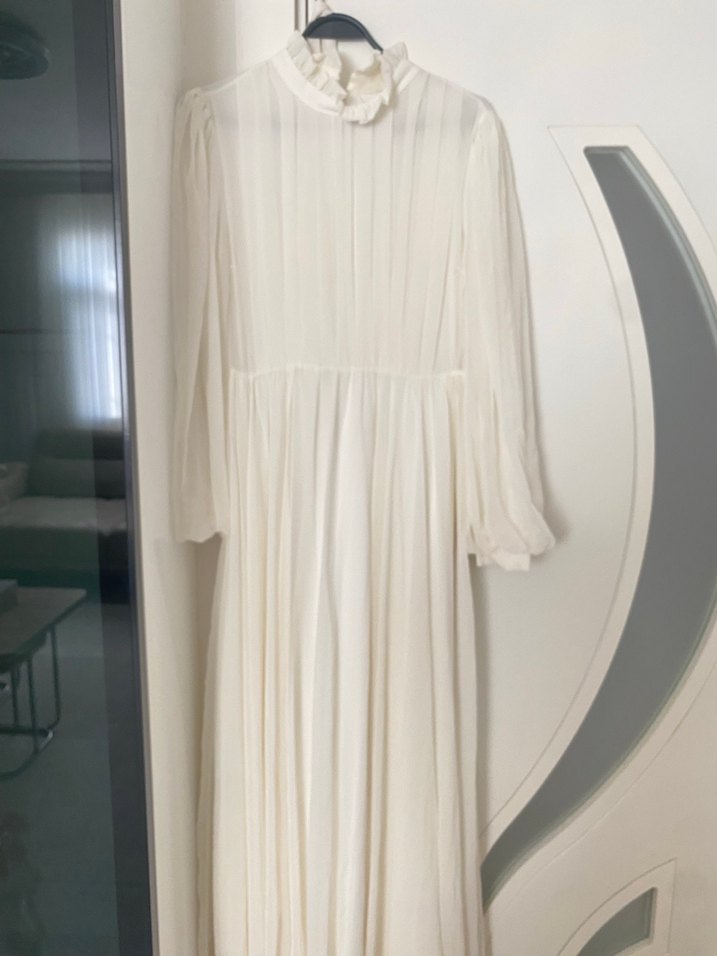 Beyaz uzun elbise, piliseli ve Uzun kollu, bol kesim arkası hafif kuyrukludur nişan mevlüd lohusa hamile nikah için uygundur. Uzun şalıda vardır kemeride mevcuttur çok çok güzel bir abiyedir hiç giyilmedi sıfır gibi