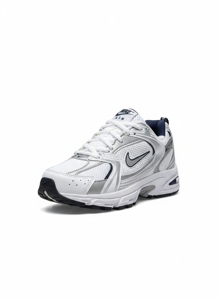 Beyaz Nike Air spor ayakkabısı, bağcıklı ve kauçuk tabanlıdır. Gri Nike logosu ve desensiz tasarımıyla spor ve günlük kullanıma uygundur.
