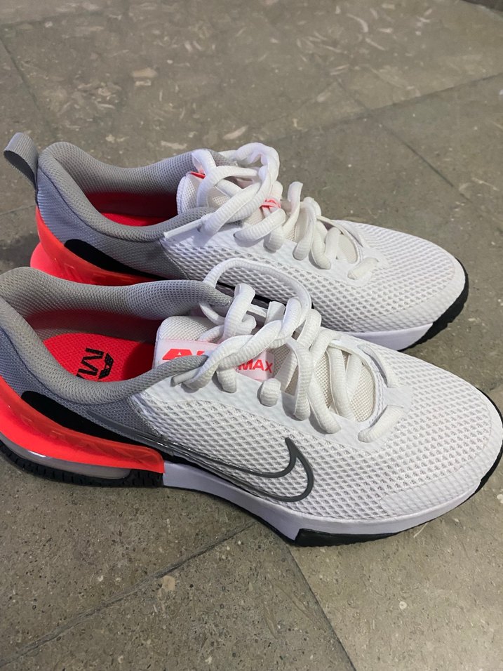 Beyaz Nike Air Max spor ayakkabı, baskılı detaylar, elastik yapısı ve blok topuklu tasarımıyla sokak modasına uygun.