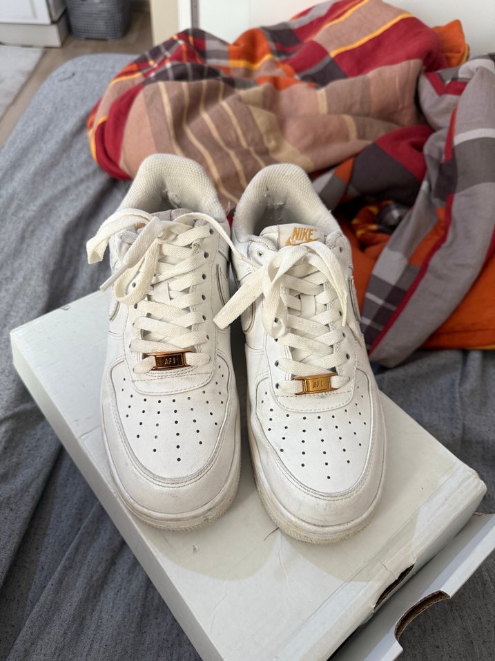 Nike marka, bağcıklı, stiletto topuklu beyaz spor ayakkabı. Kauçuk tabanlı, açık renk ve desensiz tasarım.