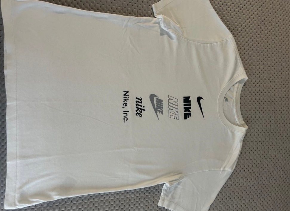 Beyaz renk, bol kesim ve kısa kollu Nike erkek tişörtü. Önünde gri tonlarda Nike logoları baskılı, spor için uygun ipeksi kumaştan. Bisiklet yaka ve normal boyda, sokak stiline uygun.