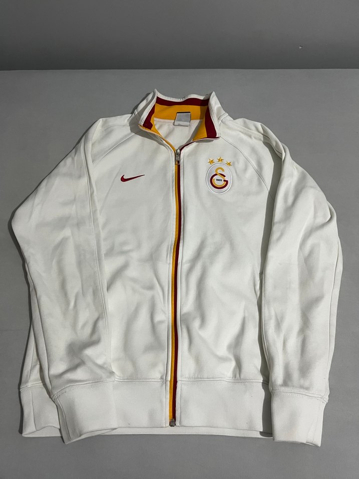 Beyaz, parlak görünümlü, uzun kollu, fermuarlı Nike sweatshirt. Yuvarlak yaka ve göğüste Galatasaray logosu bulunur. Spor ve günlük kullanım için uygundur. Orijinal üründür
