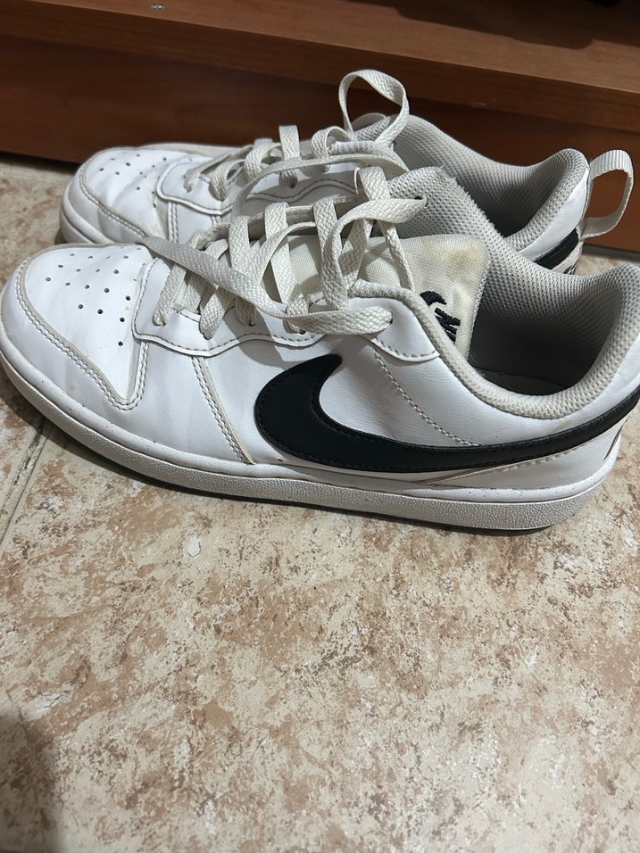 Beyaz renkte, bağcıklı Nike kadın spor ayakkabısı. Kauçuk malzemeden, gri iç detaylı, spor ve sokak stili için uygun.