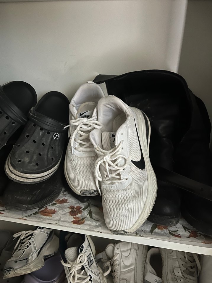 Beyaz Nike kadın spor ayakkabısı, düz kauçuk taban ve velcro detayına sahip, günlük sokak stili için uygun ve modaya uygun.