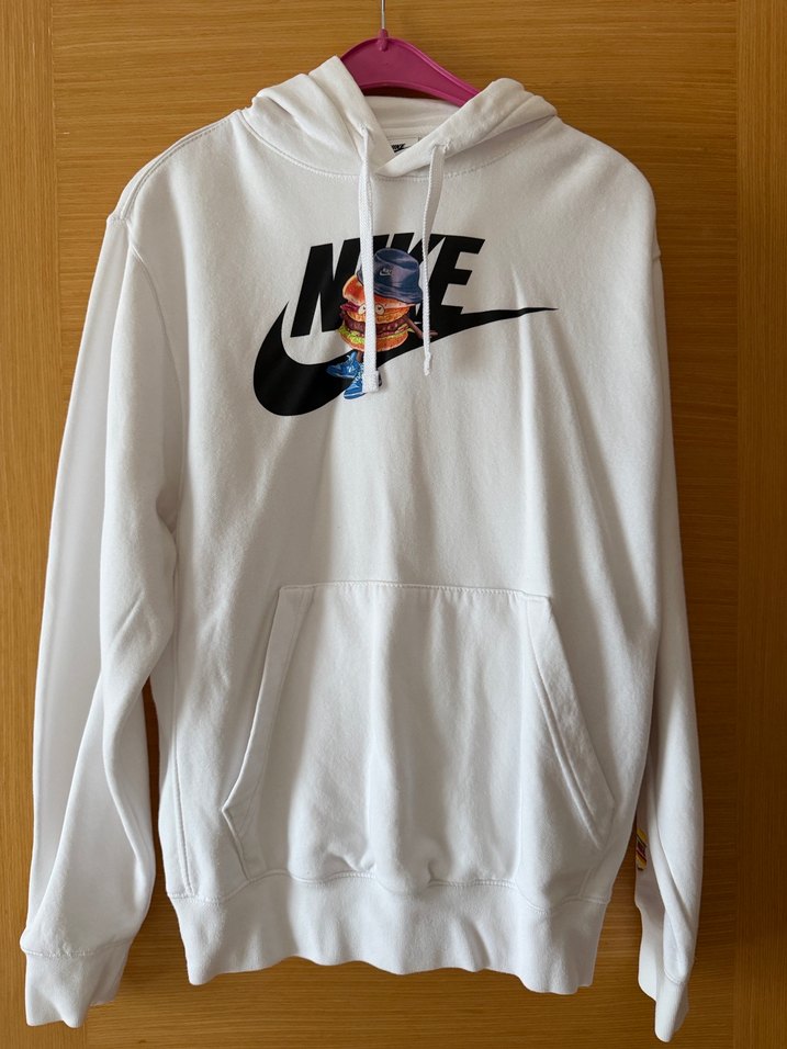 Beyaz Nike sweatshirt, uzun kollu ve yuvarlak yaka. Önünde baskılı logo bulunur. Yumuşak kumaştan yapılmıştır.