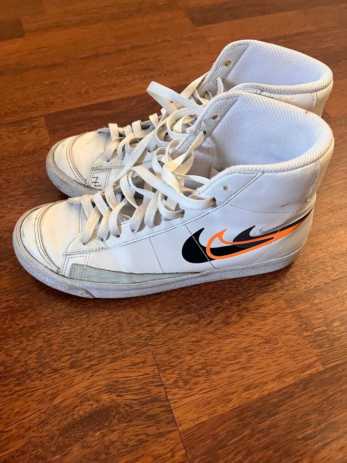 Orjinal beyaz Nike spor ayakkabısı, dolgu topuklu ve bağcıklı tasarıma sahip. Kauçuk malzemeden, spor ve sokak stili için uygun. 39 numara.Herhangi bir açılma , yırtık yok. Kullanıma bağlı lekeler ve normal deri kırışıklıkları var, fotolarda göründüğü şekilde.