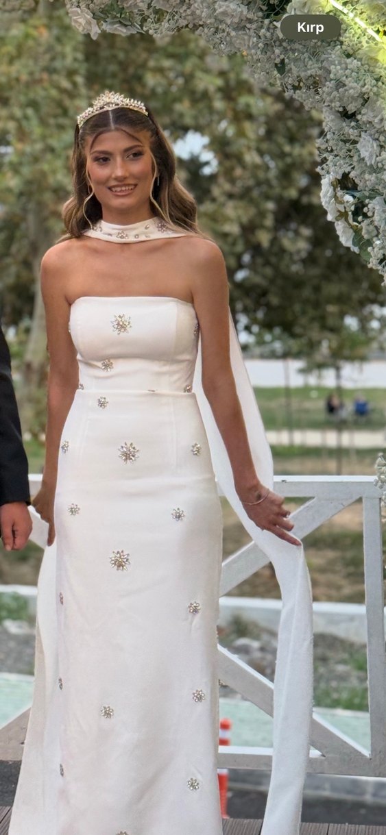 Nişanımda giydim. Fuları boyundan düğmelidir düşme yapmıyor. Taş detayları var, çok rahat bir elbise. Kuru temizlemesi yapıldı. 50 kiloyum. Boyum 1.67.