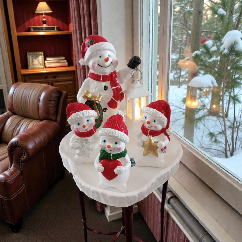 Kırmızı şapka ve atkı takan beyaz kar tanesi figürleri, elinde fener, yıldız ve kalp tutuyor. Neşeli bir tatil havası katıyor. ⛄