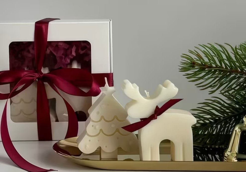 Kırmızı kurdele detaylı, beyaz renkli Noel ağacı ve geyik şeklinde dekoratif mum seti.
