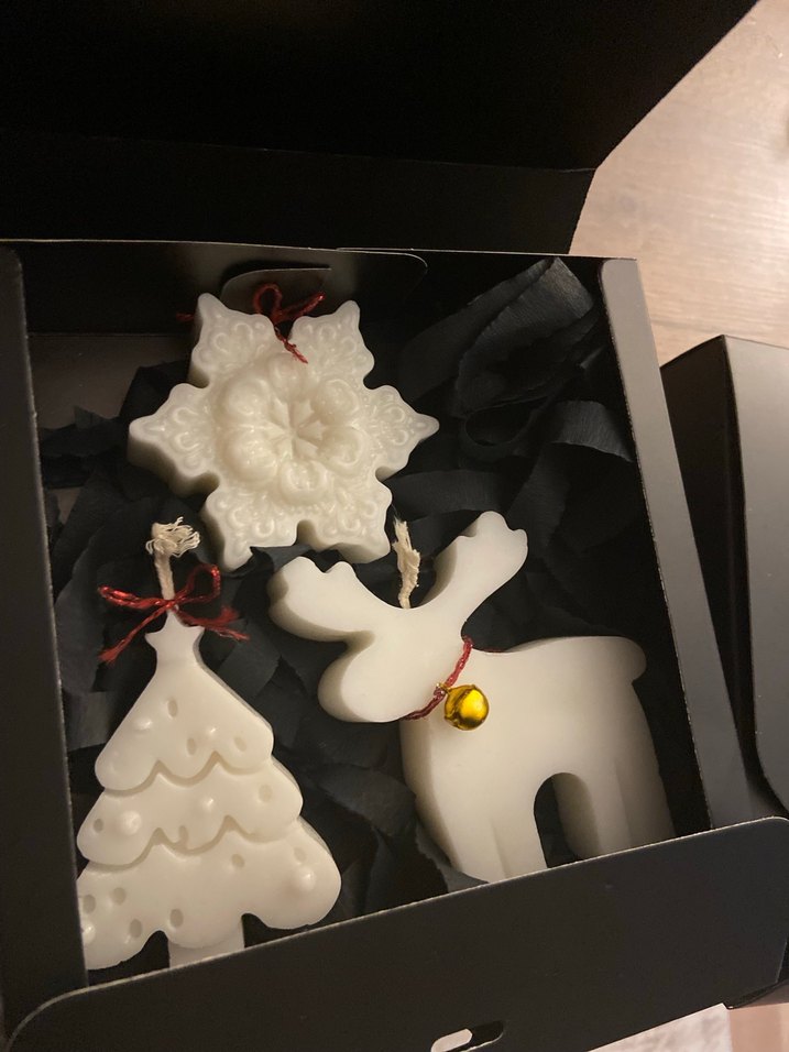 Kar tanesi, geyik ve yılbaşı ağacı şeklinde beyaz mumlar, kırmızı ip detaylı, dekoratif ve şık bir set.