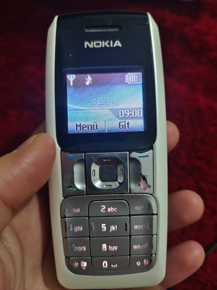 Beyaz renkli Nokia telefon, renkli ekranıyla kullanımı kolaydır. Üst kısmı koyu renkte, sade tasarıma sahip. Çalışır durumda.