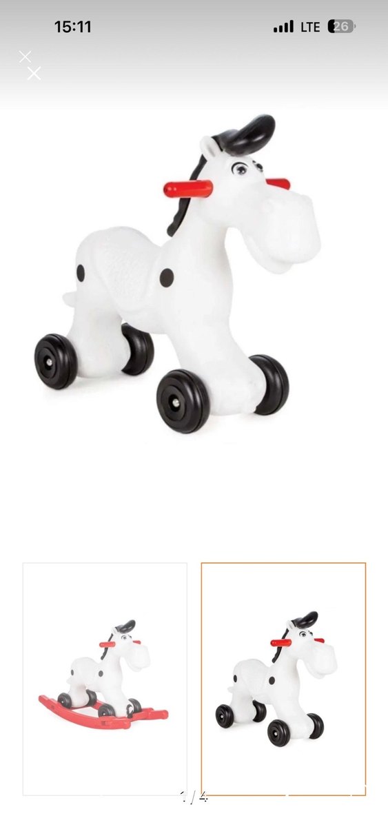 Kırmızı tutacaklı, siyah tekerlekli ve beyaz üzerine siyah noktalarla süslenmiş at şeklinde çekmeli ve itmeli oyuncak.