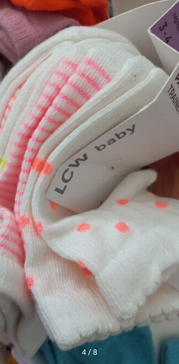 Yumuşak kumaştan yapılmış, pembe ve turuncu benekli beyaz bebek çorapları. Çizgili ve benekli desenlerde birden fazla çift içerir.