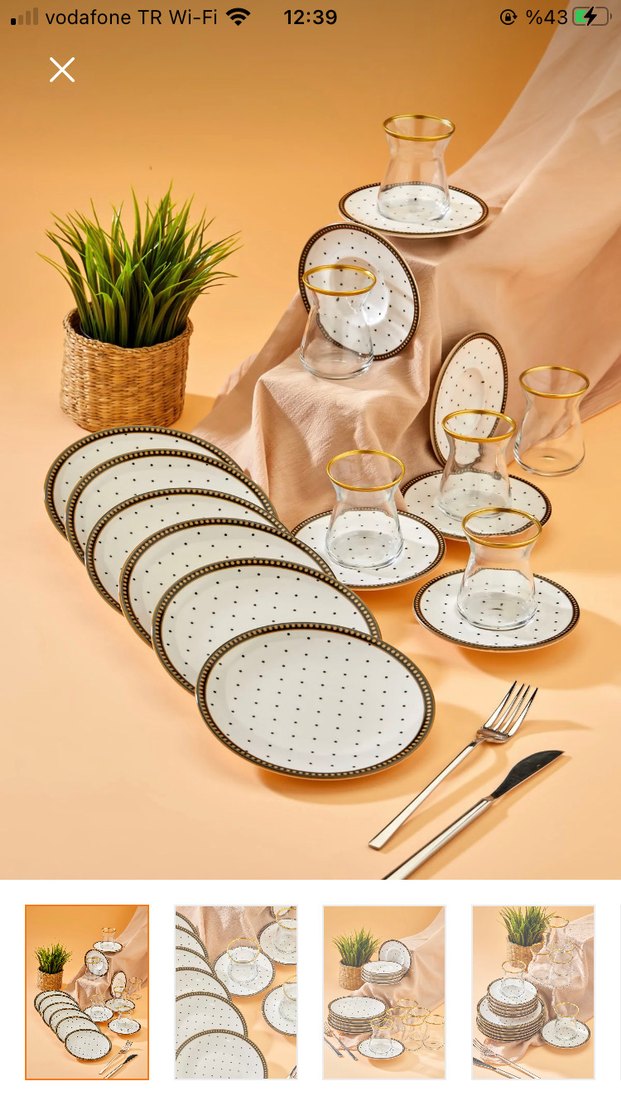 Altılı bardak ve tabak seti, beyaz zemin üzerinde noktalı desen ve altın detaylara sahip. Tabaklar hafif desenli, çay sunumu için uygundur. Trendyoldan alındı kullanılmadı sitede 1700