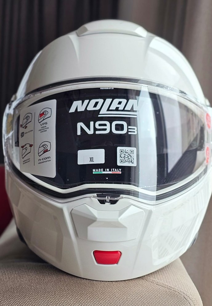Beyaz Nolan N90 motosiklet kaskı, baskılı desene ve tokalı güvenli kapamaya sahiptir. Dayanıklı plastikten yapılmış, hafif ve sade minimalist tarzda. XL beden.İntercom girişi vardır.İnternet fiyatı 18.000 bindir