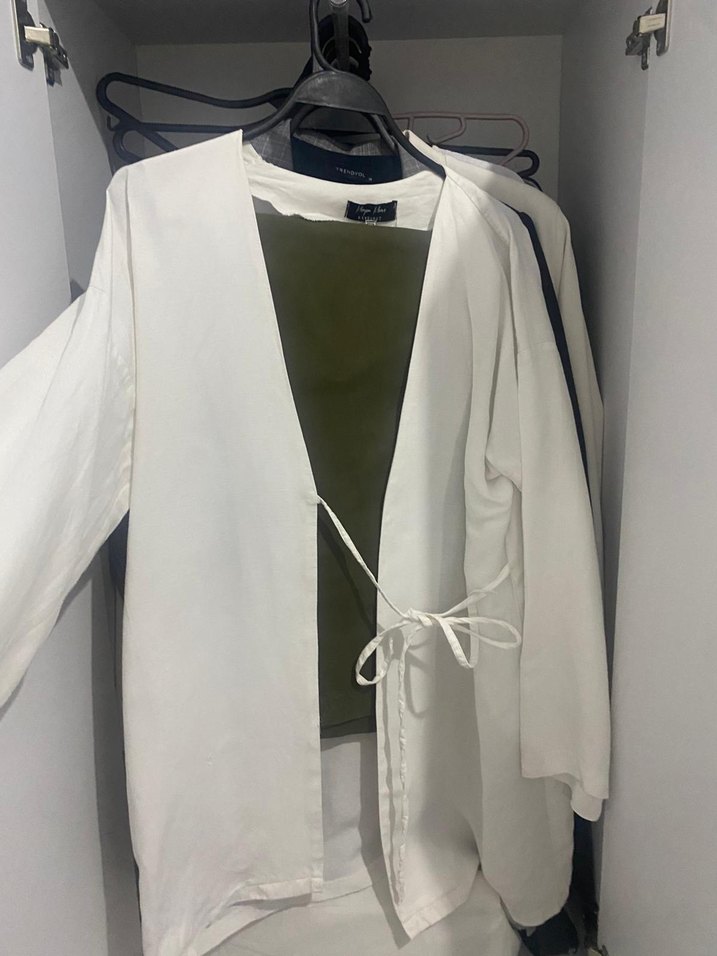 Beyaz renkte, normal boy midi uzunluğunda, düz kesim ve yakalı uzun kollu hemşirelik sabahlığı. Belden bağlamalıdır.