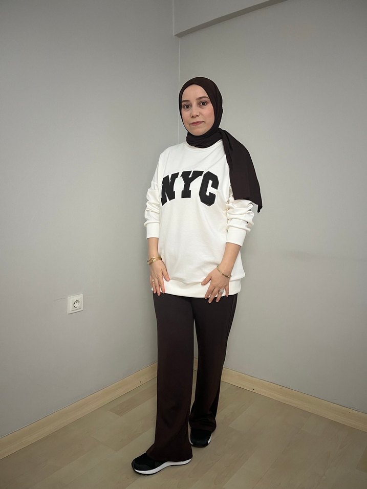 Pamuklu kumaştan yapılmış, beyaz renkli, NYC baskılı, bol kesim ve bisiklet yaka kadın sweatshirtü. İkili takım oysho kumaştır 1/2 beden olarak mevcuttur