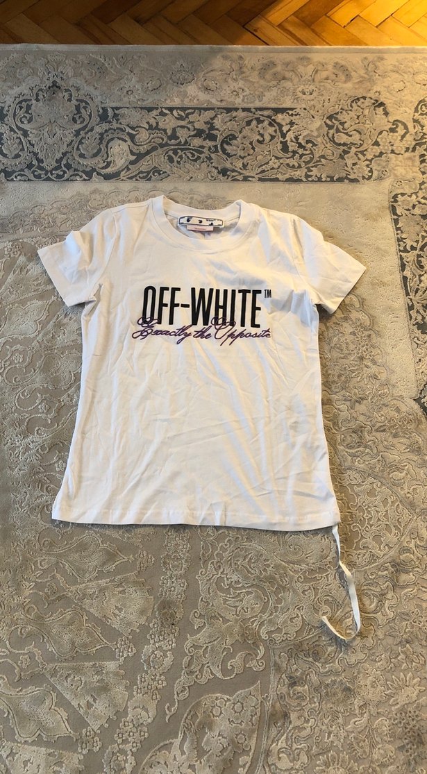 Beyaz pamuklu, baskılı Off-White logolu, kısa kollu ve bisiklet yaka erkek tişörtü. Günlük rahat şıklık için uygundur.