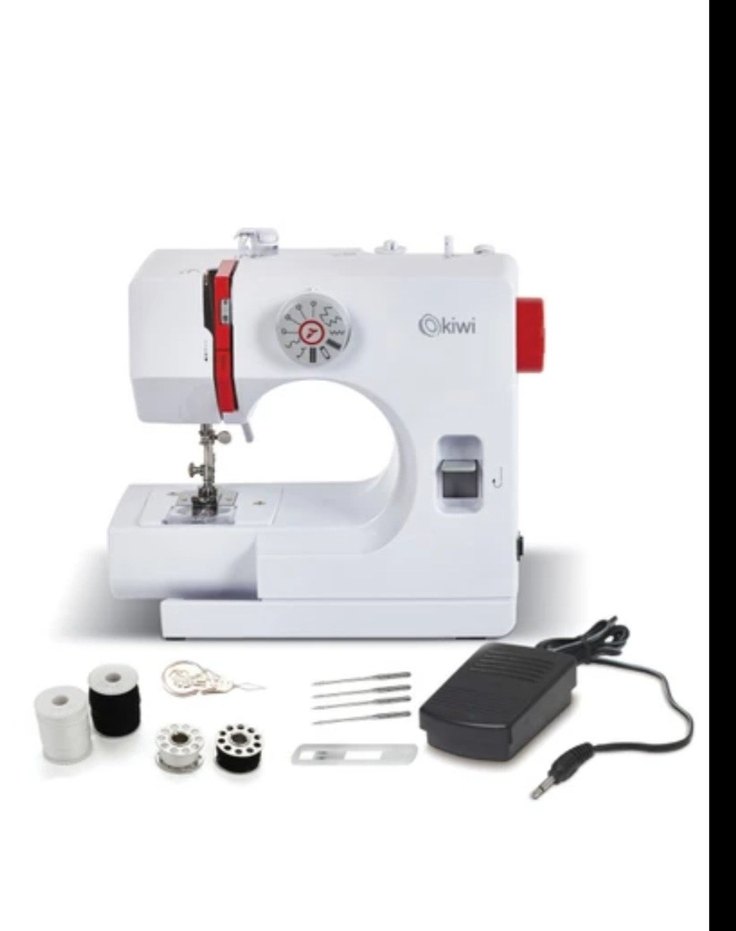 Beyaz Okiwi dikiş makinesi, iplikler, iğneler, makara ve ayak pedalı gibi aksesuarlarla birlikte gelir. Kolay dikiş seçimi ve kompakt tasarıma sahiptir.