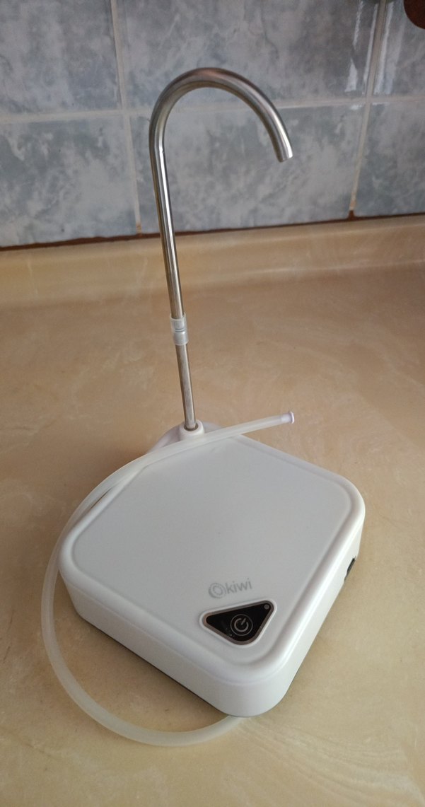 Beyaz Okiwi şarjlı damacana cihazı. Kompakt tasarımı sayesinde kolayca yerleştirilebilir. pratik kullanım. 3 - 4 kare kullanıldı