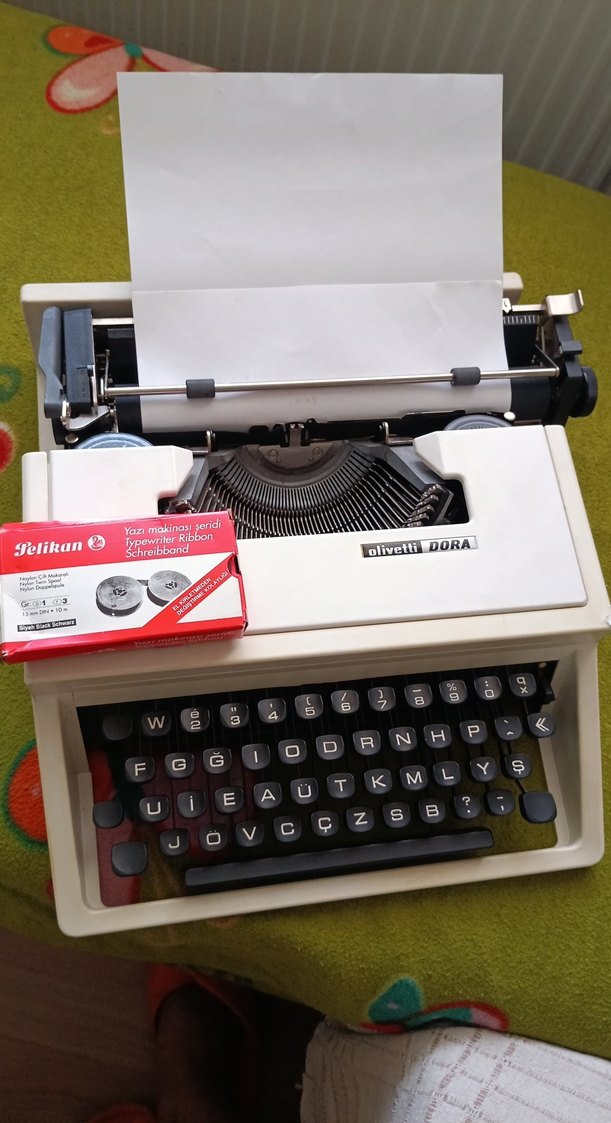 Beyaz renkli Olivetti Dora marka daktilo, Pelikan marka yazı makinesi şeridi ile birlikte.
