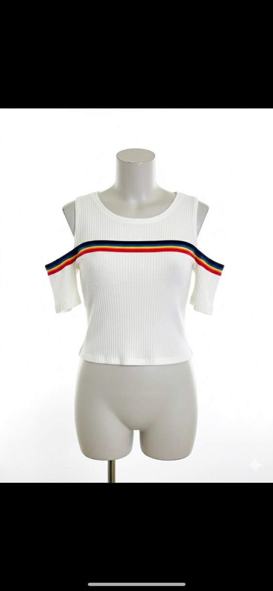 Bu beyaz örme crop top, omuz dekolteli ve göğüste renkli baskılı çizgilere sahiptir. Kısa kollu, pamuklu ve vücuda oturan kesimdedir.