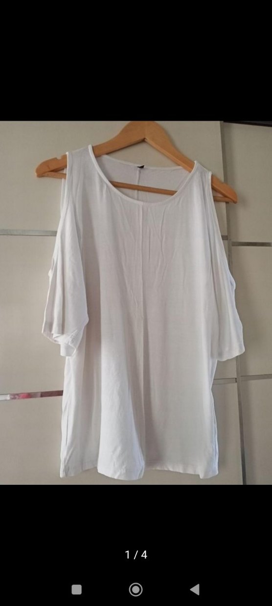 Beyaz likra penye kumaştan, salaş kesim, kısa kollu omuz dekolteli ve yuvarlak yakalı bluz. Minimalist, drapeli tasarımıyla günlük şıklık sunar. Marka öne çıkarmak için kullanılmıştır.